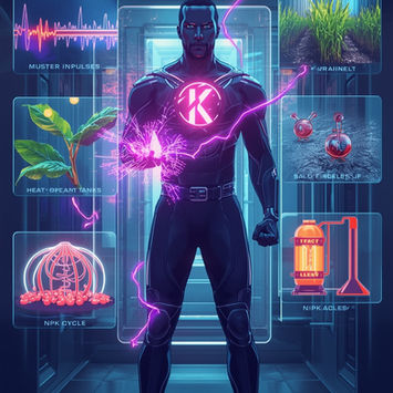 A tall, violet-charged cannon warrior with explosive power. Faster and more reactive than Sodium, he channels immense bursts of energy and drives life’s electrical rhythms.